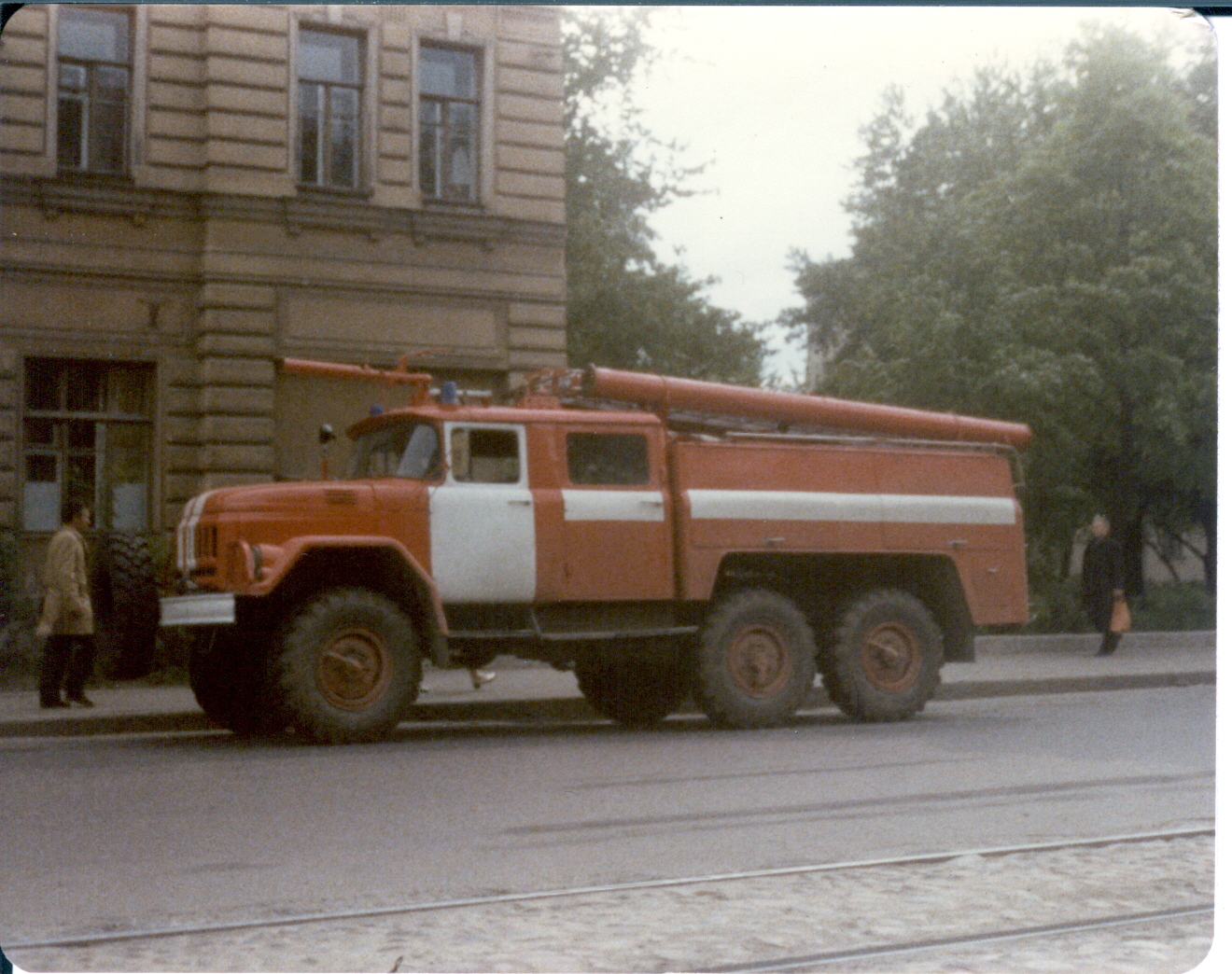 "Пожарный автомобиль связи и освещения на базе автобуса ЗиС-8, представленный на выставке в честь "30 лет Октября" около клуба Октябрьской Революции, 1947 год"