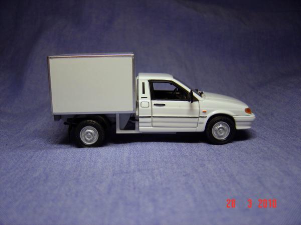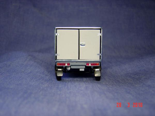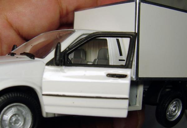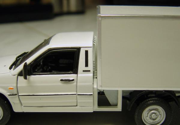 Все разборные детали красятся отдельно. Каждая мелочь! Мелочевку красил лаками для ногтей, кисточкой. Путем смешения добивался нужных оттенков. Будка, двери и кабина – слой грунта + 2 слоя краски. Краски алкидные в баллончиках, для покраски настоящих автомобилей. Шпаклевка также автомобильная двухкомпонентная. Трудность с ней только одна – она очень быстро твердеет. Если разводить отвердитель в малом количестве, она плохо твердеет и отслаивается. Поэтому отвердителя надо больше, чтобы цвет шпаклевки был ярко розовый. На нанесение шпаклевки не более 1 минуты – потом она твердеет. Поэтому шпаклевал поэтапно. Шпаклевке подверглась будка по местам соединений, задняя стенка кабины и передние крылья (после сточки боковых накладок от ВАЗ-2115 надо было восстановить форму арок крыльев). Перед грунтовкой зашкуривал весь кузов, чтобы сошкурить окисел, и мыл с Фейри в воде. Просушивал в духовке.