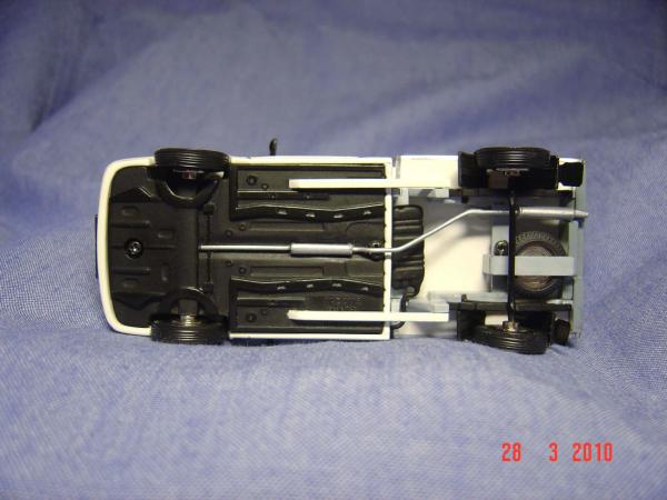 На доноре он был отлит заодно с донышком. Ножом его срезал аккуратно, чтобы не было заметно среза. Внутри резонатор надфилем проточил вдоль, чтобы проходила проволока Ø1мм. Переместил резонатор ближе к двигателю. В качестве выхлопной трубы использовал проволоку Ø1мм. В глушителе от донора высверлил с торца отверстие для проволоки Ø1мм. Проволоку изогнул на глаз, в области пересечения трубы глушителя со средней поперечной балкой шасси припаял Г-образный держатель к проволоке, верхний конец которого заходит на балку сверху (между балкой и будкой образовался конструктивный зазор в 1,5 мм. При сборке посадил на один конец проволоки глушитель на клей Момент, согнул немного проволоку, вставил один конец в резонатор, а Г-образный держатель – засунул над средней балкой. Разогнул проволоку до исходной кривизны. Перед окончательной сборкой поскрасил трубу вместе с глушителем тамиевской краской Bare Metal (сребрянка).