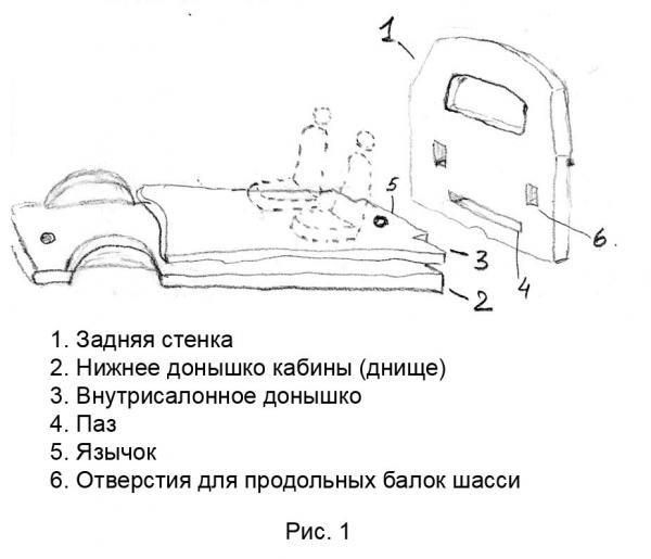 Следующим шагом отрезал от донышка лишнюю заднюю часть. Маленькая хитрость. Донышко лучше сделать прикрепляемым к кабине независимо от заднего шасси. Донышко у большинства моделек двойное – собственно дно, и отливка, которая представляет собой салон – пол, сидения, внутрисалонная облицовка дверей и т.д. В приклеенной ранее задней стенке делаем горизонтальный паз (№4, рис.1) на толщину пластика салонного пола. У меня это – 1 мм. По ширине – на глаз, примерно на половину ширины стенки (в обе стороны от вертикальной оси на ¼ ширины стенки).