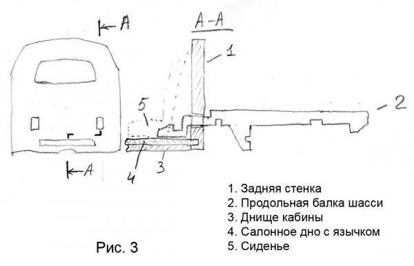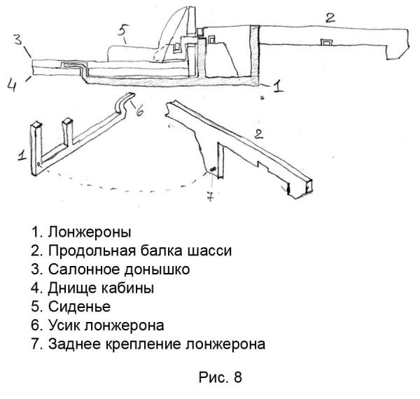 Шасси у меня имеет двойное закрепление. Шасси состоит из двух продольных балок, трех поперечных – две балки по краям спереди и сзади, и одна балка над задней осью. Продольные балки входят в кабину через отверстия (№6, рис.1) задней стенки, Конструкция выглядит так, как показано на рис.3.