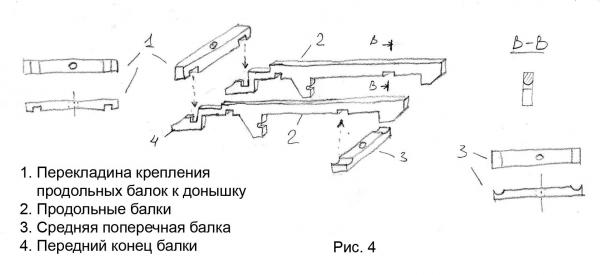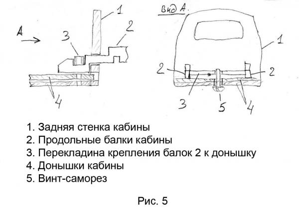 Для того, чтобы продольные балки не выскочили из кабины, на балках и перекладине сделаны ответные пазы (см. рис.4). Сильно пропиливать не нужно, чтобы не обломить кончики. Важно, чтобы в итоге, после закреплении балок, в наружной своей части они были одинаковой длины и были строго параллельны продольной оси кузова. Иначе потом кривизну не исправить. Крепеж изображен на рис.5.