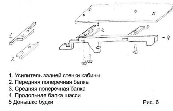 На задней стенке кабины настоящего автомобиля снаружи есть поперечная балка, которая служит усилителем при боковых ударах, чтобы кабина не сложилась внутрь и не сдавила пассажиров. Этот усилитель выпилил тоже из алюминия, но можно и из пластика, т.к. на модели он никакой силовой нагрузки не несет. Форма показана на эскизе - №1, рис.6. Усилитель кладется сверху на продольные балки. Крепление шасси к будке.