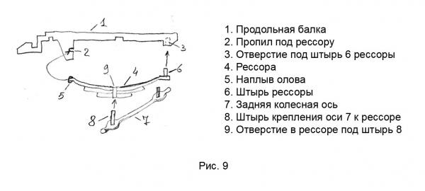 На передние концы наплавлено олово №5, а в вертикальной части шасси – поперечны пропил №2 на глубину 1,5 мм и высоту 1 мм. Пропил делался – сначала сверление сверлом Ø1мм, и потом доработка надфилем. Сбоку к пропилу приложил край рессоры с оловянным наплывом (не торцом рессоры, а боком), и плоскогубцами загнал в пропил. Лишнее олово отвалилось. Рессора плотно вошла и держится без клея. Задние концы рессор сделаны по другому. В полотне рессоры просверлено отверстие Ø0,8мм, вставлена медная проволока №6, узел пропаян, лишнее обработано надфилем, и вверх оставлен конец высотой примерно 2 мм. В продольной балке ответно просверлены отверстия №3. После покраски, когда идет окончательная сборка, задний край рессоры вставляется в отверстие в балке на клею Момент. Крепления задней оси к рессорам. Задняя ось изготовлена из медной проволоки Ø1,5мм. В местах крепления с рессорами ось расплющил, как это делал с рессорами. Но только острым концом маленького молотка. Получилось две заплющены под рессорами на оси. В заплющинах просверлил отверстия Ø0,8мм, вставил штырьки (№8, рис.9) из проволоки высотой 3-4 мм (на толщину спаянной рессоры), и пропаял соединение с осью, излишки олова обработал надфилем. В рессорах по середине (над осью) просверлил вертикально ответные отверстия Ø0,8мм (№9, рис.9) , в которые вставил штырьки задней оси. При окончательной сборке машинки эти штырьки сажаются на клей Момент.