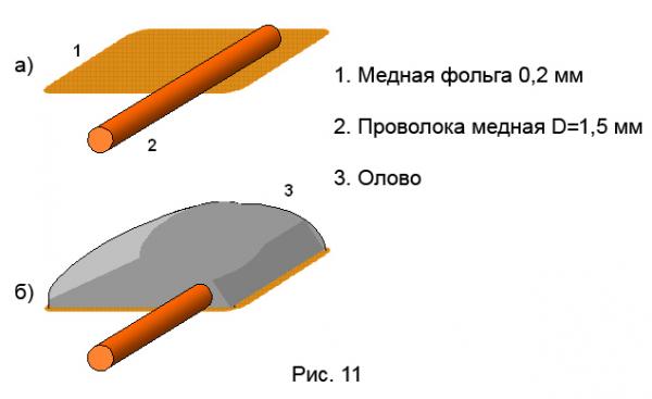 Для этого взял медную проволоку Ø1,5мм, расплющил ее с помощью молотка и наковальни до плоского состояния, и толщины на глаз достаточной, чтобы сойти за рессору – примерно 0,5 мм. Нарезал кусочки на глаз, но так, чтобы самый длинный лист рессоры упирался в точки будущих соединений с шасси. Изогнул, облудил каждую полосочку щедро оловом, совместил так, как они должны быть в итоге, по средине сжал тонкими плоскогубцами, и грел паяльником до тех пор, пока весь сендвич не прогрелся. Олово расплавилось и все полоски соединились. Не разжимая плоскогубцы – в холодную воду. Если ошибся с первого раза – прогрел, рассоединил, облудил заново и – вторая попытка. Крепления концов рессоры к шасси реализованы по-разному. См. рис.9.